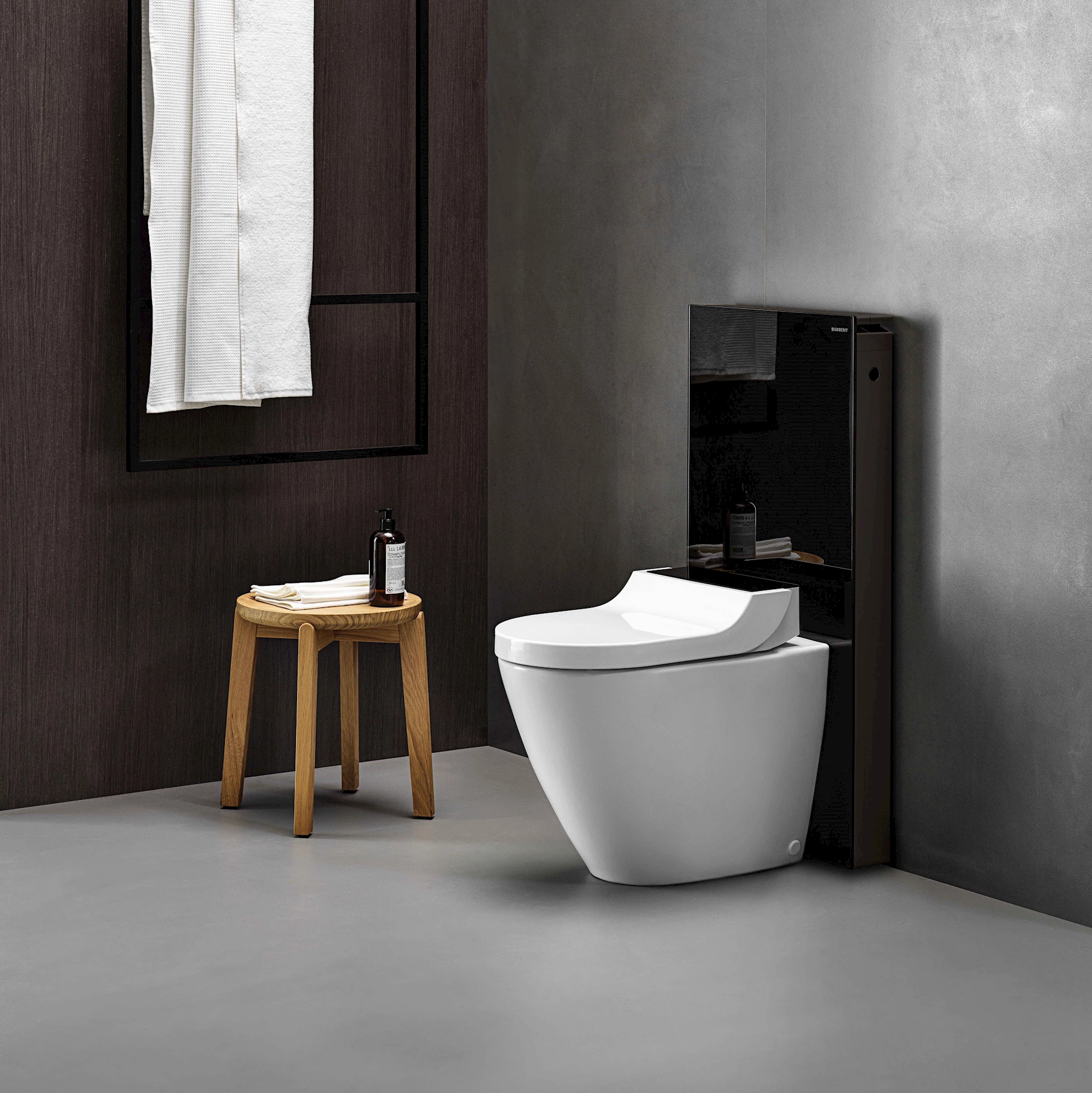 Til høyre vises dusjtoalettet AquaClean Tuma fra Geberit.